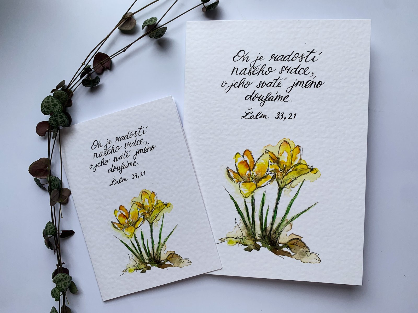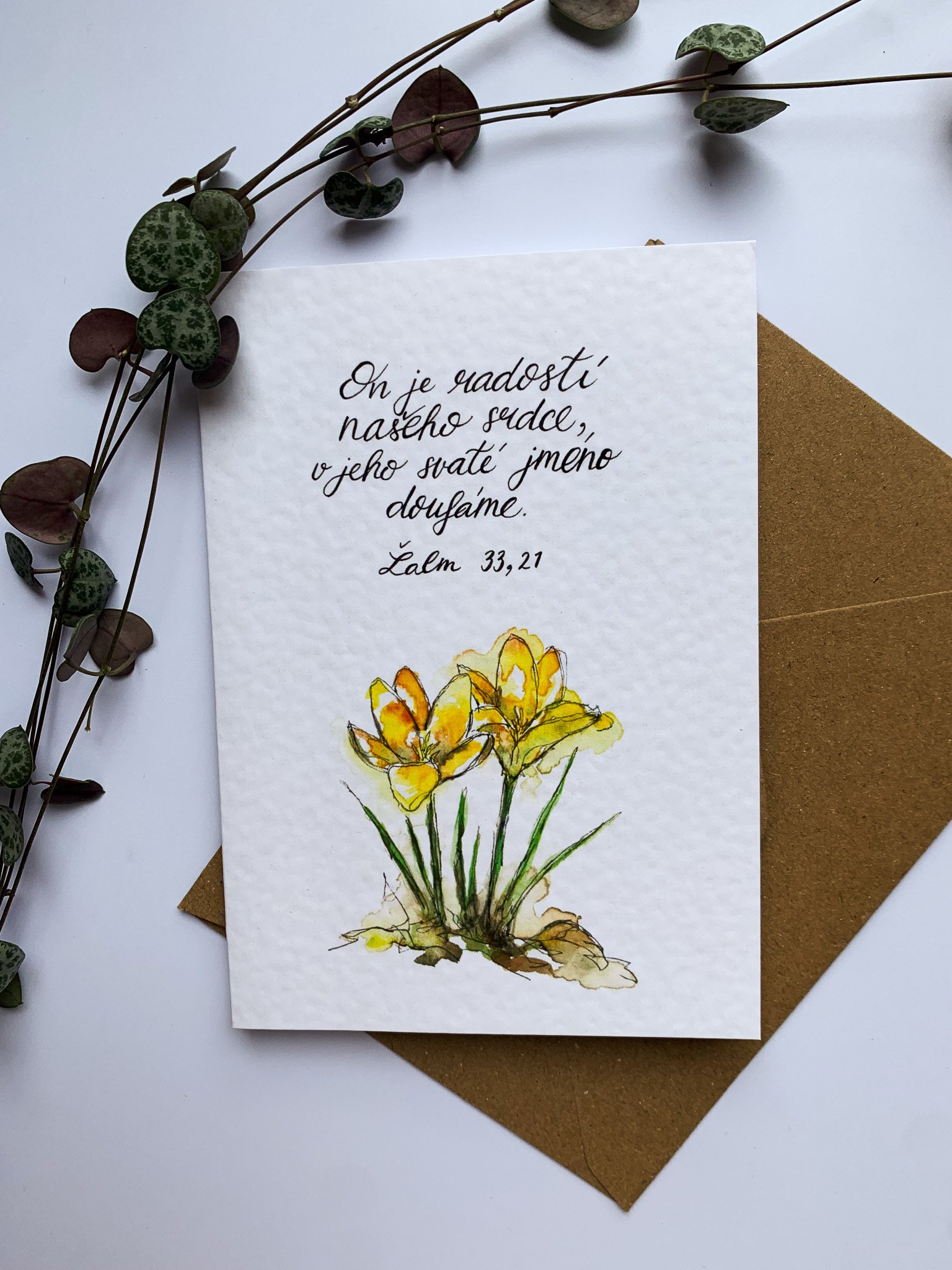 Přání s veršem On je radostí našeho srdce, v jeho svaté jméno doufáme (Žalm 33,21) se hodí k příležitosti narozenin, svátku nebo jen tak pro radost. Je možné jej také použít jako obrázek k zarámování nebo připnutí na ledničku.